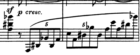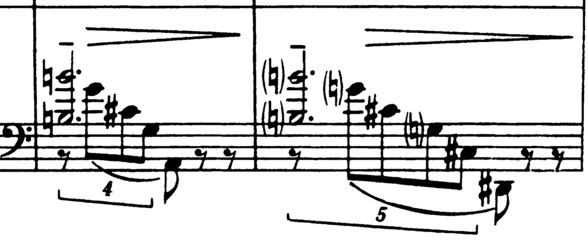 Moving on, bars 9 to 12 are transitional; they introduce some new ideas and don't really stick to the outer product theme. Probably because he is writing music and not some weird array programming math blog. The next section will suit us better, and what catches the eye first is an intimidating, oscillating left-hand line, delivered in 5:3 tuplets.